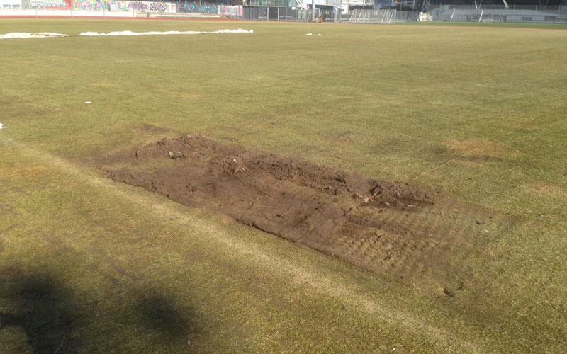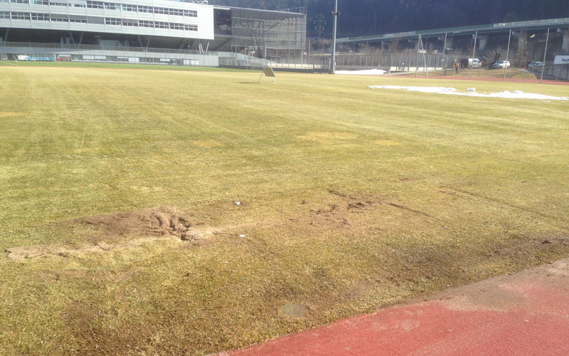 Die Profis haben ihr Trainingslager in der Türkei beendet. Groß war die Sehnsucht endlich auf Naturrasen trainieren zu können. In heimischen Gefilden war das trotz eines überaus milden Winters nicht möglich. Denn im Land der Berge wurde auf dem Trainingsgelände des FC Wacker Innsbruck ein 42 Meter hoher Stahlrohr-Koloss gebaut. Knapp drei Wochen dauerten die Auf- und Abbauarbeiten für den Air&Style Contest. Nach dem Event zeigte sich, dass 14.000 Paar Füße und die 285 Tonnen schwere und 42 Meter hohe Stahlkonstruktion die Trainingsinfrasturktur des FC Wacker Innsbruck nicht ungeschoren ließen und einige heftige Wunden auf dem Tivoli W1 hinterließen. Auch der Kunstrasenplatz, auf dem sich die Konzertbühne befand, hat gelitten.