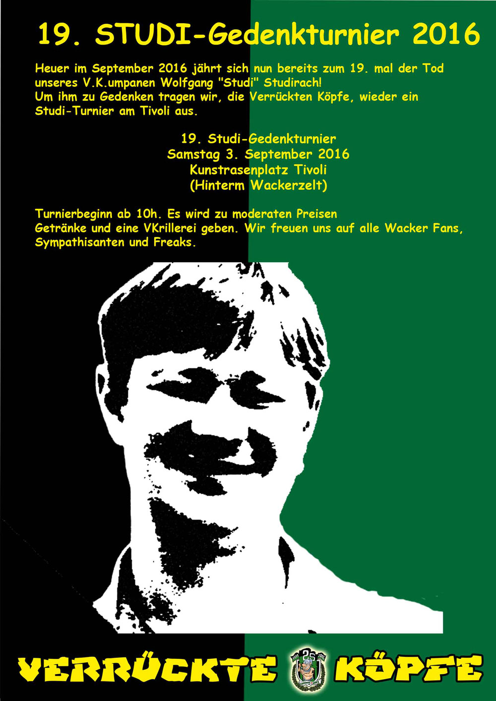 Am ersten September-Wochenende ist es wieder so weit! Das 19. Studi-Gedenkturnier steigt am Samstag, 3. September ab 10.00 Uhr am Tivoli-Kunstrasen neben dem Tivoli Stadion Tirol. Für Speis und Trank wird wieder bestens gesorgt sein und der Spaß kommt bei der aktiven Turnier-Teilnahme oder dem geselligen Treiben rund herum sicher nicht zu kurz. Im Gedenken an Studi wird das Leben und die Liebe zum FC Wacker Innsbruck gefeiert. Studi, grüß uns die Sterne!