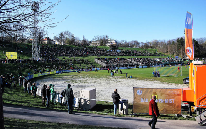 Mittlerweile hatte sich die Arena gefüllt. Kaiserwetter in Döbling und die meisten Fußballfans dort können Natur und Stadionatmosphäre zugleich genießen. Früher hat man auf den Wiesen der Naturtribüne sogar gegrillt. Aber auf jedem Fall ein tolles Erlebnis. Dass die Grün-Weißen es verstehen Stimmung zu machen, weiß man ja, aber auch insgesamt war die Atmosphäre eine richtig tolle gewesen. Und wenn ich an die Hohe Warte denke, erfüllt mich nicht erst seit diesem Spiel die Ehrfurcht!