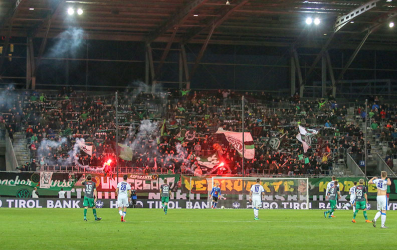 Vor dem Spiel gegen den FC Liefering präsentierte die „Tivoli Nord“ eine tolle Choreographie, an der alle Fanclubs beteiligt gewesen sind. Vor ihrer Tribüne wurde eine Festung hochgezogen. Und wie schon später im Spiel, war der ärgste Feind der Festung ein heftiger Föhnsturm. Dieser drohte das Kunstwerk der Fanclubs zu verblasen. Aber was dann geschah ist vielleicht sinnbildlich für diese Saison. Die Risse wurden gekittet und die Festung gestützt. Fast so wie im richtigen Leben. Die Mannschaft schwebt auf einer Sympathiewelle, wird gestützt, getragen und unterstützt von ihren Fans.