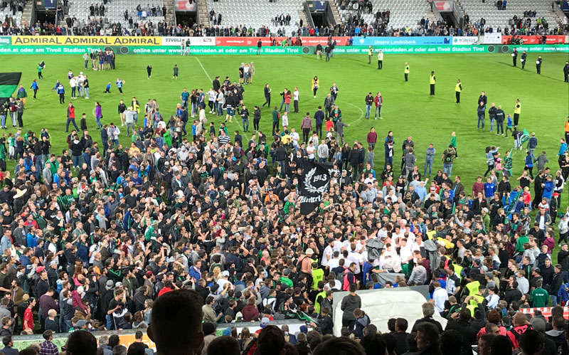 Ich sag mal so, wir sind froh um jeden Zuschauer und müssen das Publikum erst wieder zurückgewinnen. An die 14.000 Fans haben in den letzten beiden Spielen das Tivoli gestürmt und hatten ein tolles Erlebnis. Aber das Stammpublikum ist schon gesunken. Zu viel ist passiert. Verlorene Derbys: sei es gegen unseren Erzrivalen aus Salzburg oder die WSG und vieles andere mehr… Ein Teil der Fans blieb dabei aber immer treu und aktiv. Egal was da los gewesen ist, wie sehr uns medial und von Neidern Spott und Häme entgegengebracht worden ist, unser Stammpublikum ist jedes Spiel zum Tivoli gepilgert. Man gab nicht auf, diskutierte und hat den Verein auch trotz diverser Eigenfehler nicht fallen gelassen. Was dann Präsident Gerhard Stocker mit seinem Team geleistet hat, kann man mit Worten nicht beschreiben. Unterstützt vom Clubmanagement, welches charakterlich, menschlich und vom Einsatz her zum Verein paßt – ihnen allen ist zu Danken. Ohne deren Einsatz könnten wir wahrscheinlich Purzelbäume schlagen. Wir wären dann vielleicht schwindlig vom Rollen, aber nicht vom Feiern. Danke für euren Einsatz und dank dem Publikum, dass in den letzten Jahren dem Verein die Treue gehalten haben!