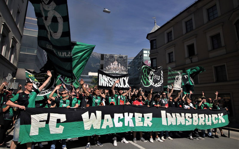Mit einer Mannschaft von kaum 21 Jahren Durchschnitt ging es also im Juli in Liga Zwei. Eine Stahlliga, die Nerven braucht. Die schwarz-grüne Anhängerschaft hat sich jedenfalls über ihr sehr junges Team gefreut. Zwar haben in der laufenden Saison nur ca. 2200 Besucher im Schnitt das Tivoli erfreut. Aber wer da war, wird bestätigen, dass trotzdem die Atmosphäre äußerst positiv war. Selbst nach Niederlagen. Da wurde das junge Team um Leader (und den frisch gebackenen Ehemann) Alex Gründler bis eine viertel Stunde nach Spielschluss gefeiert. Beweis gefällig? Bitte sehr: https://www.facebook.com/tivoli12/videos/2343487159314688/ . Bei Siegen wurde es im Stadion zunächst ganz still, ehe Fahnen und Schals hoch gingen und sich einem bei der Hymne der Tivoli Nord die Gänsehaut austellt. Absoluter Höhepunkt war der sensationelle Wackermarsch von der Innsbrucker Altstadt bis zum Tivoli im Vorfeld des Traditionsduells gegen den GAK.