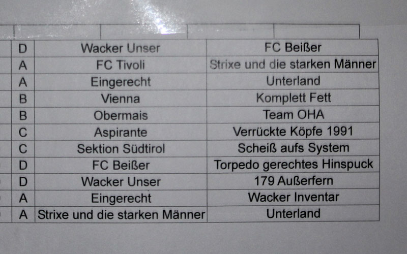 Und der erste Höhepunkt hat am vergangenen Samstag stattgefunden. In der Leitgebhalle zu Innsbruck ging ein Fanturnier über die Bühne. 17 Teams haben da ihr Können und ihre Leidenschaft am Parkett gezeigt. Besondere Kreativität haben unser Fans bei ihren Teamnamen bewiesen. Siehe links.