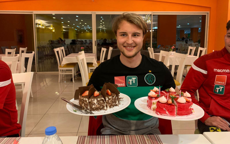 Zurück im Hotel gab es beim Abendessen dann auch noch etwas zu feiern. Die Mannschaft hatte sich spontan dazu entschlossen den Geburtstag von Athletiktrainer Elias Braunhofer vorzuverlegen und gebührend mit einem „Happy Birthday“ zu besingen. Natürlich durfte auch eine Torte für ihn nicht fehlen, denn ein bisschen Spaß gehört zu einem guten Trainingslager ja auch dazu ?. Alle Gute, Elias!