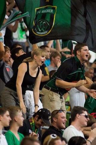 27. Juli 2018, 20.30 Uhr: Das Spiel Austria Wien gegen Wacker Innsbruck (gleichbedeutend mit der Rückkehr des FCW in die Bundeliga) wird angepfiffen. Meine wackeren Mitstreiter und ich befinden uns zu diesem Zeitpunkt nicht – wie eigentlich anzunehmen – im Gästesektor der neu eröffneten Generali-Arena, sondern noch im Fanbus der „I Furiosi“, der in Begleitung einer Polizei-Eskorte durch das südliche Wien rast. Wir sind aber bereits nahe genug am Stadion, dass wir die Tormusik, die bei einem Tor für die Austria erklingen würde, hören könnten. Da wir nichts hören, sind wir halbwegs beruhigt. Als der Fanbus dann endlich das Stadiongelände erreicht, eilt zuerst die ganze „Horde“ im Laufschritt über einen an der Südosttangente gelegenen Spazierweg, der zum Gästesektor führt, und muss noch die Eingangskontrolle über sich ergehen lassen, was bei den (wenigen) Damen natürlich um einiges schneller geht als bei den (vielen) Herren. Und so kommt es, dass in der 19. Minute Julia W. und ich bereits auf der Tribüne sind, während sich viele der männlichen Mitreisenden noch im Eingangsbereich aufhalten. Eine Flanke von Stefan Rakowitz wehrt ein Austrianer ab, allerdings direkt vor die Füße von Zlatko Dedic. Als er knapp vor dem Tor den Ball hat, denke ich noch rücksichtsvoll an die noch nicht anwesenden Fans, gleichzeitig aber auch, dass er ihn trotzdem „reinhauen“ soll, was er auch tut. Riesiger Jubel im Gästesektor (Wir sind jetzt wirklich zurück in der Bundesliga!), aber die wirklich unfassbaren Szenen spielen sich unter der Tribüne ab. Die Leute dort glauben zuerst an ein Tor der Austria, weil sich der Jubel im Stadion so laut anhört. Als dann aber kein Torlied zu hören ist und ein Wacker-Fan ihnen die „frohe Kunde“ überbringt („Für uns!“), gibt es kein Halten mehr. Wie bei der spanischen Stierhatz die Bullen durch die engen Gassen getrieben werden, so versuchen die Wackerfans auf schnellstem Wege durch die ihnen unbekannten Katakomben ins Stadioninnere zu gelangen (Freundliche Ordner weisen ihnen dankenswerterweise den Weg), um dort den Führungstreffer lautstark zu feiern bzw. sich zu vergewissern, dass dieser auch tatsächlich gefallen ist.