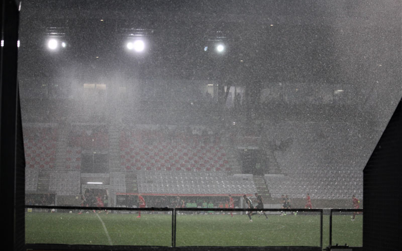 Es stand bereits 2:0 für den FCW, als der Himmel seine Schleusen öffnete. Und wie. Die Leute auf der Osttribüne sind reihenweise geflüchtet, weil der Wind den Starkregen bis in die letzte Reihe geblasen hat. Das Spielfeld wurde zum Wildwasser und die Spieler eine Mischung aus Wasserballern und Schiffbrüchigen. Zum Glück brachte der Schiedsrichter das Spiel über die Zeit.