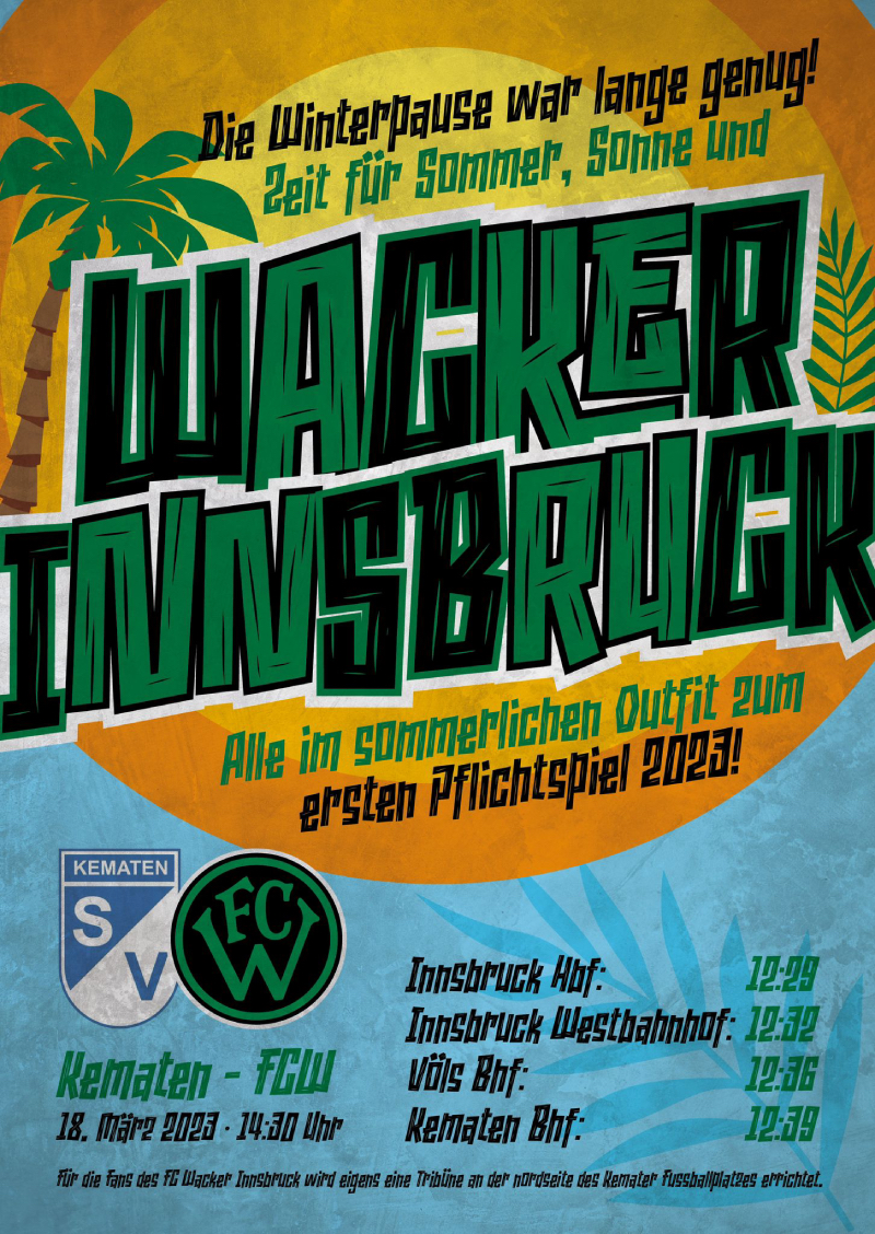 An Kematen haben die Wacker-Fans nur die besten Erinnerungen. Das Fanklub-Gedenkturnier war dort schon zu Gast und konnte sich von der Gastfreundschaft überzeugen. Zudem absolvierte der FC Wacker Innsbruck an der selben Wirkungsstätte vor drei Jahren ein Testspiel gegen Dynamo Dresden, das bestens organisiert war. Die Tivoli Nord reist am 18.03.2023 um 12.29 Uhr (Innsbruck Hauptbahnhof) mit der Bahn nach Kematen. Eine Auswärtsfahrt von 10 Minuten. Und das auch noch umweltfreundlich dazu. Es wird eine Mottofahrt der „Tivoli Nord“, schließlich wurde ausgegeben im „sommerlichen“ Outfit zu erscheinen. Bleibt zu hoffen, dass die „Eismanda“ nicht verfrüht zuschlagen.