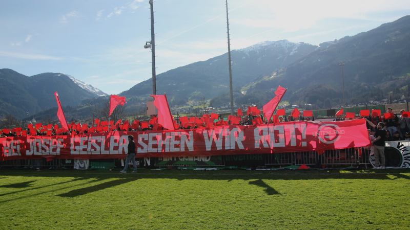 Die Tivoli Nord präsentierte eine tolle zweiteilige Choreografie mit einem Seitenhieb auf TFV Präsident Josef Geisler. Zwar hätte der Fügener Anhang auch Blätter zum Hochhalten bekommen, aber bis ins Tal der Krapfen hat es sich offenbar noch nicht herumgesprochen, dass eine Choreografie lässig aussieht, wenn alle mitmachen. Darum schossen die Schwarz-Grünen gleich noch eine zweite hinterher. „Schwarz-Grün, bis in den Tod.“ Tolle Stimmung und eine tolle Atmosphäre inmitten einer Landschaft, welche Massen an Gästen ins Zillertal anlockt. Wenn man auch Augen für das drumherum hat, erkennt man warum. Einfach traumhaft und das bei richtigem Kaiserwetter. Aber was war denn da auf dem Rasen los? Die Schwarz-Grünen erspielten sich gegen den klaren Favoriten aus Fügen Chance um Chance. Das einzig Ärgerliche der ersten Halbzeit war, dass es nur 2:0 für unsere Burschen gestanden ist. Mehrfach tauchten die Schwarz-Grünen alleine vor dem Kasten der Fügener auf. Ein Originalzitat eines Fügener Funktionärs während der ersten 45 Minuten klang wie Musik in meinen leidgeprüften wackeren Ohren. „Die lassen sich von diesen jungen Buam ja schwindlig spielen“. 1400 Zuschauer sorgten für ein weiteres Volksfest.