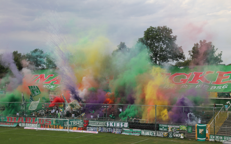 Dass ein simples Testspiel zwischen zwei Amateurteams mit sehenswerten Intros ihrer Fans beginnt, sieht man wahrlich auch nicht oft. Viel Rauch auf beiden Seiten, Überrollfahne im Heimsektor hier, Trikotchoreo im Auswärtssektor. Die Fanlager boten tolle Support, den ich hoch über der Mittellinie im reinsten Stereoton genießen durfte. Eine echt lässige Choreografie zu Beginn der zweiten Halbzeit von unseren Fans rundete das Erlebnis bei BSG Chemie Leipzig ab. Viele Fahnen, Feuer, Rauch und Konfetti (Chaos-Choreografie). Beide Kurven waren toll. Interessant auch, einmal nicht nur gewohnte Gesänge zu hören. Eines will ich aber erwähnen, hoch über der Mitte des Stadions konnte man kaum einen akustischen Unterschied zwischen den Kurven wahrnehmen. Vonseiten der Heimischen gab es ein Spruchband für die kleine Charlotte. „Kämpfe weiter, wie eine Löwin“. Das Mädchen leidet unter einer seltenen Krebsart. Die Therapie ist sehr teuer. Die Fangemeinde der BSG unterstützt die Familie. Die Wackerfamilie wünscht Charlotte alles Glück und eine rasche GENESUNG! Auch greifen die Grün-Weißen ihrem Verein immer wieder unter die Arme und auch die jährliche Saisoneröffnung dient dazu, außerordentliche Ausgaben des Vereins etwas zu lindern. Ich durfte einige tolle Gespräche führen. Danke für eine außergewöhnliche Gastfreundschaft!