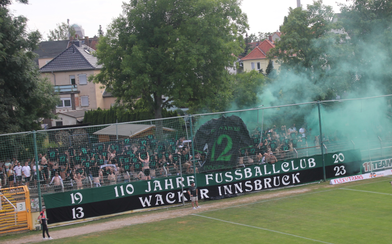 Wieder zurück im schwarz-grünen Lager habe ich sehr viele alte Bekannte getroffen. Silke und Co. vom Eintracht Fanclub „AFAM“. Ach, was haben wir gemeinsam schon für Feste gefeiert. In Frankfurt, aber auch bei uns in Tirol. War das schön, Freunde wiederzusehen! Und auch zwei Kameraden aus FFM, deren Gastfreundschaft ich in der Nähe der Mainmetropole schon genießen durfte, waren auch dabei. Begrüßen durfte ich auch Freunde aus Thun und Fürth. Besonders haben mich die Gespräche mit unseren Südtiroler Nachbarn aus Obermais gefreut. Alle haben mich gefragt, wie es mir denn geht. Wie soll es schon gehen, wenn man solche Erlebnisse haben darf? Man bekam auch viel Anerkennung von Leipziger Seite. Praktisch jeder hofft auf ein Rückspiel! Im Internet haben sich zwei Chemiker gemeldet und gemeint, der Auftritt der Tivoli Nord im Alfred-Kunze-Sportpark zähle zu den Top drei Auswärtsauftritten in ihrem Stadion der gesamten letzten Saison. Ein weiterer meinte gar, bedenkt man die Strapazen und die Bedingungen sowie die Kreativität, wäre Wacker sogar ganz oben. Sei es, wie es sei. Es war einfach toll!