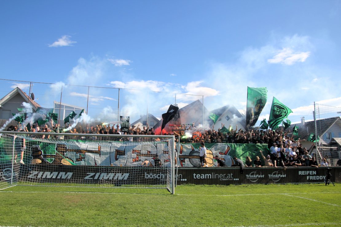 Im Westen Österreichs herrschte am Samstag vor einer Woche pures Kaiserwetter. Der Himmel präsentierte sich wolkenlos, und die klare Herbstluft ließ die Berge scheinbar in greifbarer Nähe erscheinen. Aber wir Schwarz-Grüne hatten nichts Besseres zu tun, als ins Ländle zu einem Regionalligaspiel zu fahren. In Lustenaus „Holzstraße“ erwartete uns ein Holzstadion, das wahrlich nicht aus schlechtem Holz gebaut ist. Der FC Wacker Innsbruck samt seiner Anhängerschaft übermittelte dem FC Lustenau 1907 am 20. September 2025 seine Glückwünsche zum 118. Jahrestag der Gründung. Hiermit waren die Zuwendungen jedoch erschöpft. Die Wackerianer erzielten am Spielfeld fünf Tore und waren absolut dominant, und die Anhänger der Schwarz-Grünen sorgten für eine echte Heimspielatmosphäre des FCW weit hinter dem Arlberg.