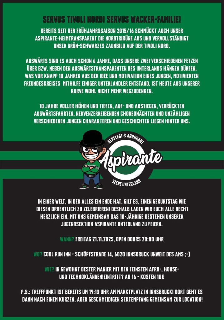 So brannten am Freitag auf der „Nord“ auch hunderte Wunderkerzen. Wie einst beim UEFA-Cup-Triumph gegen Spartak Moskau. Am 10. Dezember 1986 waren tausende solcher Wunderkerzen zu bestaunen, und der Tivoli mutierte zum wiederholten Male zum Tollhaus. Beinahe 39 Jahre später und unzähligen Erfahrungen reicher ist der Tivoli immer noch ein kleiner Hexenkessel. Für viele Wackerianer ist in all den Jahren der Funke und das Feuer für den FC Wacker Innsbruck nie erloschen. In dieser Hinsicht mögen wir, als langjährige Anhänger des Tiroler Traditionsvereins, gegenüber jüngeren Generationen im Vorteil sein. Es war uns vergönnt, glanzvolle Triumphe, internationale Spiele, Torerfolge, aber auch Tränen und Enttäuschungen unmittelbar mitzuerleben. Was den jüngeren Generationen in dieser Weise bisher nicht ganz so zuteilwurde. Und dennoch erwacht in ihnen der Funke und die Begeisterung um den FC Wacker Innsbruck. So ladet der Nachwuchs des Fanclubs Unterland (Aspirante) alle Wackerianer zu ihrer 10-Jahres-Feier am 10. November in der Innsbrucker Schöpfstraße 14 ein.