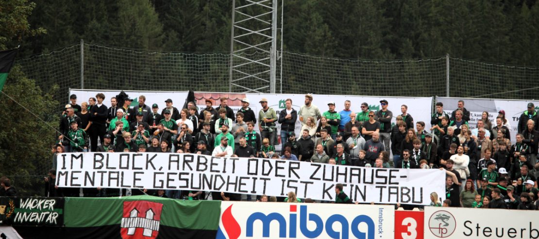 Den Tiroler Printmedien zufolge lag der bisherige Zuschauerrekord in der Velly Arena bei einem Ligaspiel gegen Austria Salzburg bei 2500 Besuchern. Diesen Rekord hat der FC Wacker Innsbruck regelrecht pulverisiert. Auch mithilfe einer tollen Zusatztribüne auf der Südseite der Arena. Die Tivoli Nord ganz im Süden. Beim Betreten des Geländes ist man zunächst von diesem kleinen, aber feinen Fußballstadion in Imst beeindruckt. Die Organisation bei diesem Schlagerspiel darf man als sehr gut bezeichnen. Nach drei herausragenden Jahren in den Tiroler Unterhausligen, die sich mittlerweile auf die angrenzenden Bundesländer ausgedehnt haben, spielt Imst in Sachen Spielstätte ganz vorne mit. Es gab zum Speisen zwar nur Bratwürste, mit oder ohne Pommes, aber was benötigt man denn mehr? Zillertal Bier gab es. Ist das ein Beweis dafür, dass die Zillertaler die besseren Geschäfte machen als die regionalen Starkenberger? Den Heimischen zufolge sollten etwa 1400 Schwarz-Grüne in der Velly Arena ihrem Team die Daumen gedrückt haben. Ob sie sich da nicht massiv verrechnet haben? Im gesamten Areal waren reichlich Wackerianer anzutreffen – nicht nur im Süden. Eine sehr starke Botschaft präsentierte der Fanclub „Wacker Inventar“ zum „Europäischen Tag der Depression“ am 5. Oktober 2025 (siehe Foto). Der „Europäische Tag der Depression“ wurde zunächst von 2004 bis 2019 am 1. Oktober begangen. Seit 2020 findet er am ersten Sonntag im Oktober statt.