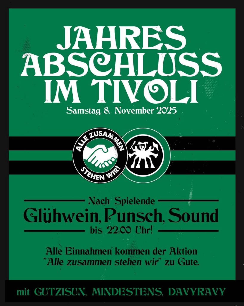 Am Samstag wird darüber hinaus beim letzten Heimspiel vor der Winterpause der Jahresabschluss im Tivoli gefeiert. Nach Spielende warten unterhalb der Nordtribüne Glühwein, Punsch und Sound auf die Fans des FC Wacker Innsbruck. Dabei werden nicht nur die heißen Getränke, sondern auch drei DJs den Anwesenden einheizen, wenn der Herbstmeistertitel bis 22.00 Uhr gebührend gefeiert wird. Alle Einnahmen kommen dabei der Spendenaktion zugute.