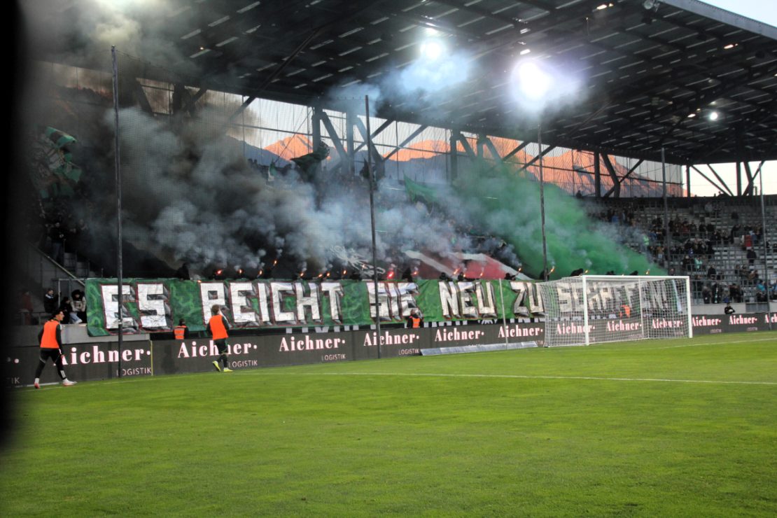 An dieser Stelle wurde bereits wiederholt über die Historie der Nordtribüne des Tivoli berichtet. Es gab Zeiten, in denen jeder mehr oder weniger dabei sein wollte. Ja, die Nordtribüne würde Platz für 4.600 Personen haben. Das Cup-Spiel gegen den SK Rapid hat aufgezeigt, welche Möglichkeiten sich bieten könnten. Ich möchte mich jedoch nicht eingehend mit der Vergangenheit auseinandersetzen. Der Gegenwart und der Zukunft gebührt mehr Bedeutung. Momentan überträgt sich ein solches Ausmaß an Energie von der schwarz-grünen „Nordkurve“ auf die Westtribüne, dass dies Freude bereitet. Die gegnerischen Mannschaften reisen nicht zum Tivoli, um ein offensives Spektakel zu veranstalten. Es wird vielmehr angestrebt, den wackeren Ballesterern jeglichen Handlungsspielraum zu nehmen. Nicht allein im ersten Durchgang gegen die Pongauer zeigte sich erneut, dass die Spiele für den FCW keineswegs mühelos zu bewerkstelligen sind. Gelegentlich ist ein beträchtlicher Kraftaufwand vonnöten, wie die Begegnung mit dem SC Schwaz verdeutlichte. Jedoch ist die Leistung, welche die unermüdlichen Anhänger Woche für Woche im Fanblock zaubern, schon mehr als beeindruckend. Ein fulminantes Spektakel der Emotionen und Leidenschaft. Diese Tendenz erstreckt sich zunehmend auf die Sitzplatzbereiche. Zu beinahe jedem Spiel werden eindrucksvolle Choreografien vorbereitet und anlässlich des Spieltags präsentiert. Dieses Mal die Jubiläumschoreografie von „Wacker Unser“. Herzliche Gratulation zu 15 Jahren „Rebellion!“ Der Fußball endet nicht mit dem Abpfiff eines Spiels.