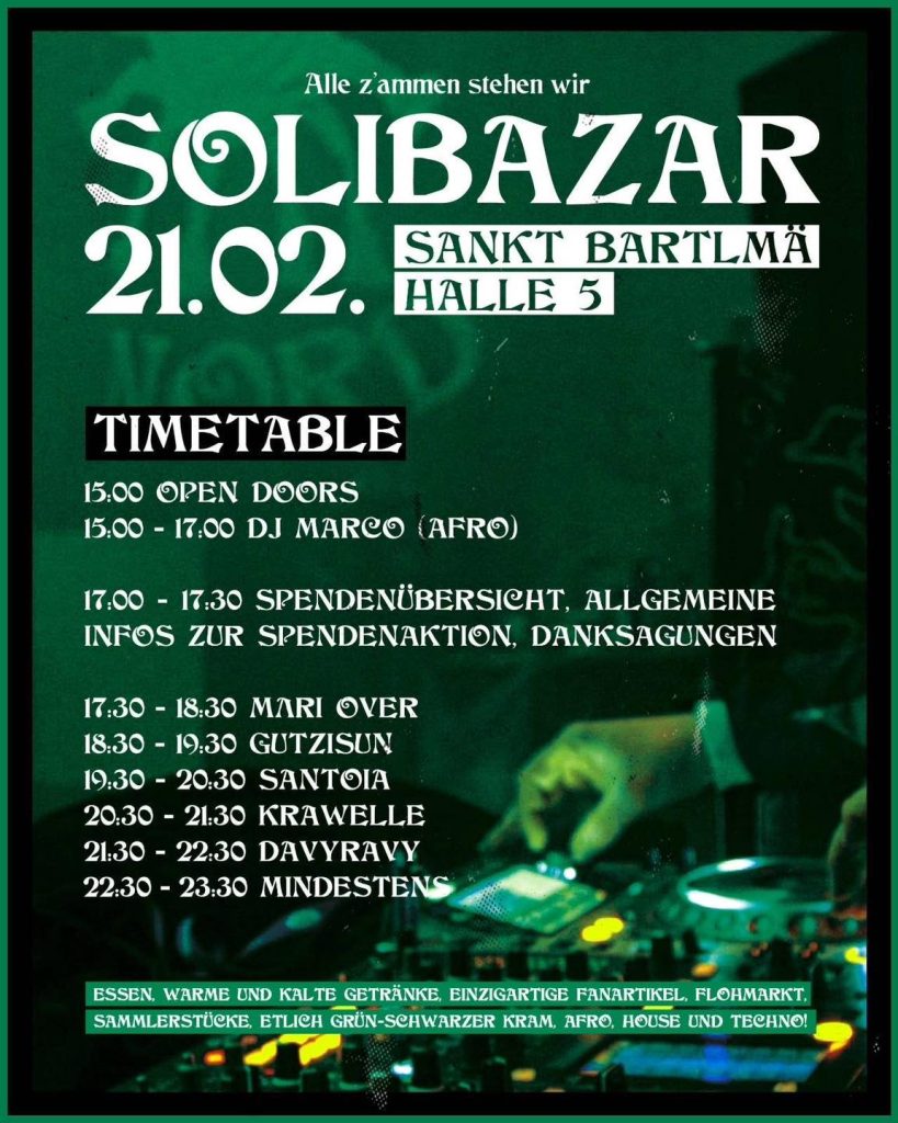 Am 21.2. ist es endlich soweit: Unsere Spendenveranstaltung, der erste Soli-Bazar der Tivoli Nord, zu Gunsten der Obdachlosenhilfe in Innsbruck steht an. Es erwarten euch kalte, sowie warme Getränke, gutes Essen, etliche schwarz-grüne Fanartikel, Sammlerstücke und einige Specials bzw. must-have‘s! Natürlich gibt es auch (etwas abseits der Verkaufsstandl) ordentlich was auf die Ohren – unser geiles Line-Up könnt ihr dem Flyer entnehmen!