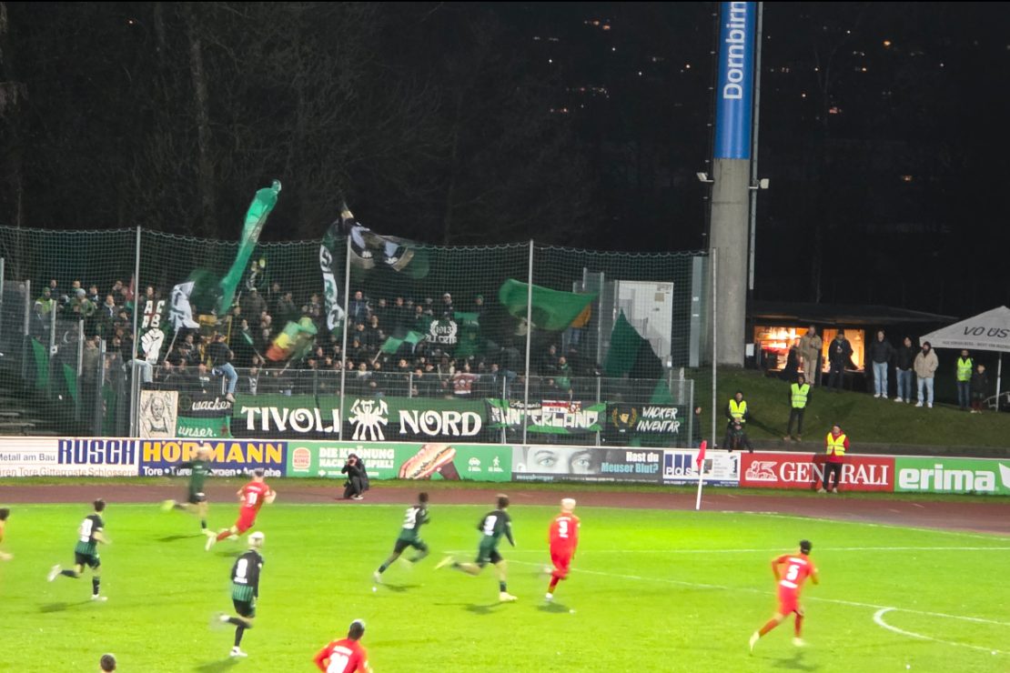 So war es keine große Überraschung, dass sich auch am vergangenen Mittwoch viele Wackerianer auf der Birkenwiese einfanden. Wenngleich eine äußerst ungünstige Wetterprognose vorlag. Die Anhänger des FC Wacker Innsbruck lassen sich durch so etwas aber keinesfalls entmutigen. Ein Auswärtssektor ohne Überdachung, eine zeitlich wahrlich ungünstige Ansetzung für Auswärtsfahrer? Ist doch egal. Die Fans brauchten die Strapazen jedenfalls nicht zu bereuen. Erneut erzeugten die Schwarz-Grünen fern der Heimat Gänsehaut-Atmosphäre. Die Begegnung zwischen dem Tabellenzweiten und dem Tabellenführer gestaltete sich von Beginn an als eine ausgesprochen einseitige Partie. Nur stellenweise vermochten die Vorarlberger dagegenzuhalten. Angetrieben durch die Anfeuerungen mehrerer hundert Anhänger, agierten die Gastgeber chancenlos und Wacker meisterlich. Nach einer fulminanten zweiten Spielhälfte waren die Rothosen mit dem 0:3 noch gut davongekommen.